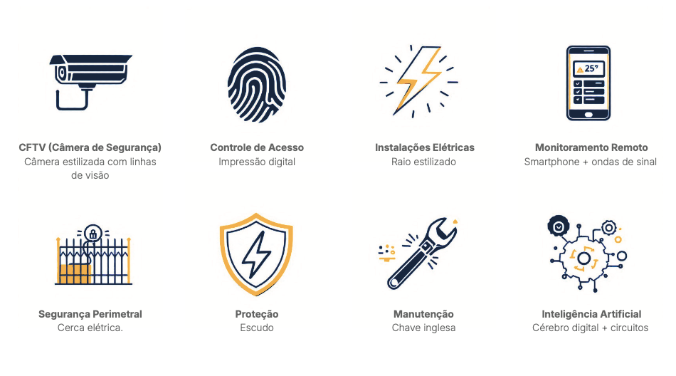 - Sistema de ícones de apoio (CFTV, controle de acesso, monitoramento remoto, IA, etc.)